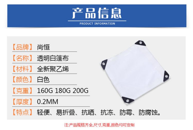 產(chǎn)品介紹透明白色PE防水篷布產(chǎn)品信息參數(shù),篷布產(chǎn)品規(guī)格齊全,尺寸、克重、顏色均可定制。透明白色PE防水篷布產(chǎn)品細(xì)節(jié),加厚包角設(shè)計(jì)。規(guī)···